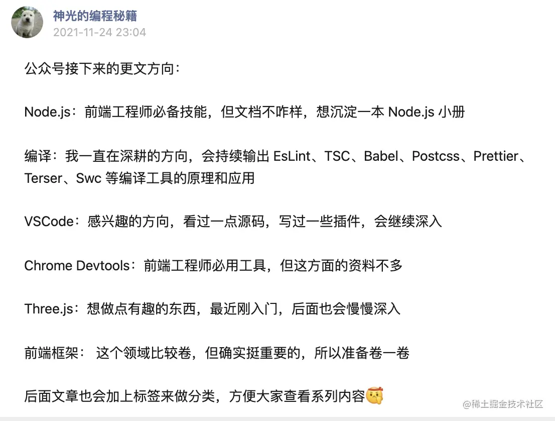 编译方面,Babel 只是一个开始,后续还有 PostCss、Eslint、Typescript 源码 等内容要写,我定下了 3 年内把这些内容写完并且写一本前端编译的书的计划: