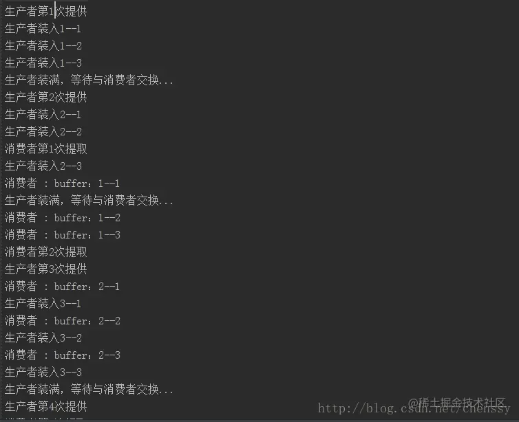 首先生产者Producer、消费者Consumer首先都创建一个缓冲列表,通过Exchanger来同步交换数据。消费中通过调用Exchanger与生产者进行同步来获取数据,而生产者则通过for循环向缓存队列存储数据并使用exchanger对象消费者同步。到消费者从exchanger哪里得到数据后,他的缓冲列表中有3个数据,而生产者得到的则是一个空的列表。上面的例子充分展示了消费者-生产者是如何利用Exchanger来完成数据交换的。