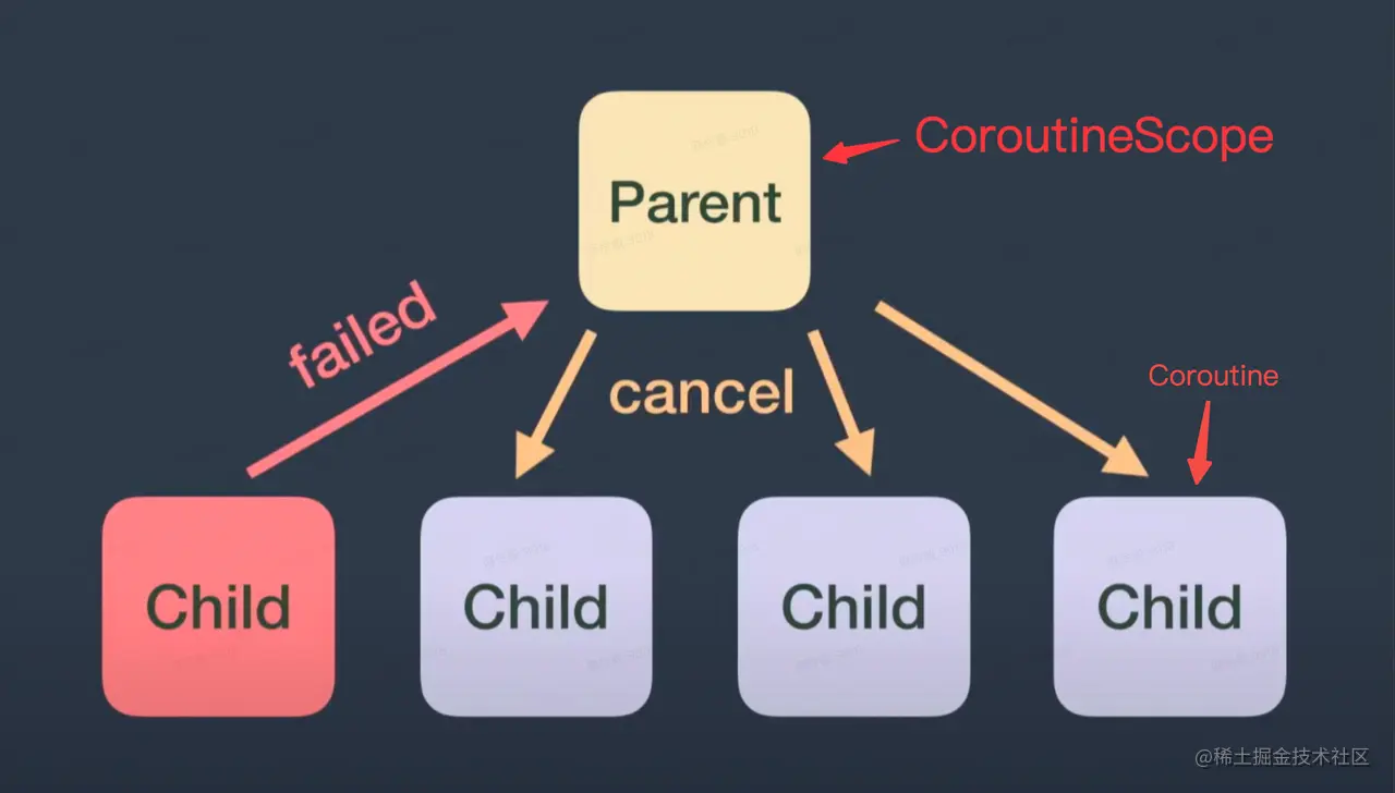 - 协程管理:协程作用域会等待所有子协程完成才会标记为完成运行。子协程的生命周期依附于其父协程作用域的生命周期。
