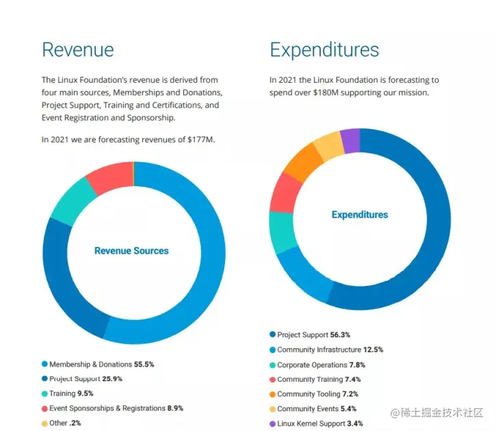 基金会的收入来自四个方面:会员资格和捐款、项目支持、培训和认证以及活动注册和赞助。在 2021 年,基金会预测收入为 1.77 亿美元,而支出为 1.8 亿美元。