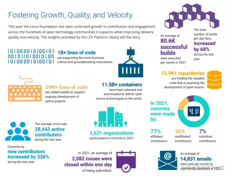 今年,Linux 基金会在其支持的数百个开放技术社区的贡献和参与中持续增长,同时提高了交付质量和速度。据报告显示,在基金会的 LFX Platform,有超过 10 亿行代码支持最关键的业务和开创性的创新。2021 年,约有 2082 个问题在提交后的一天内被解决;过去一年,做出贡献的平均活跃人数为 28,443 人,新贡献者增加了 336%,有 3,631 个组织参与其中。