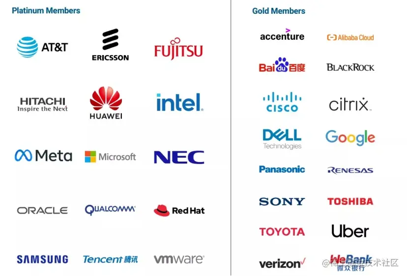 在 Linux 基金会中,白金会员包括华为、腾讯、微软、三星、Oracle、Meta、英特尔等知名企业,黄金会员则有百度、阿里云、谷歌、索尼、优步等。