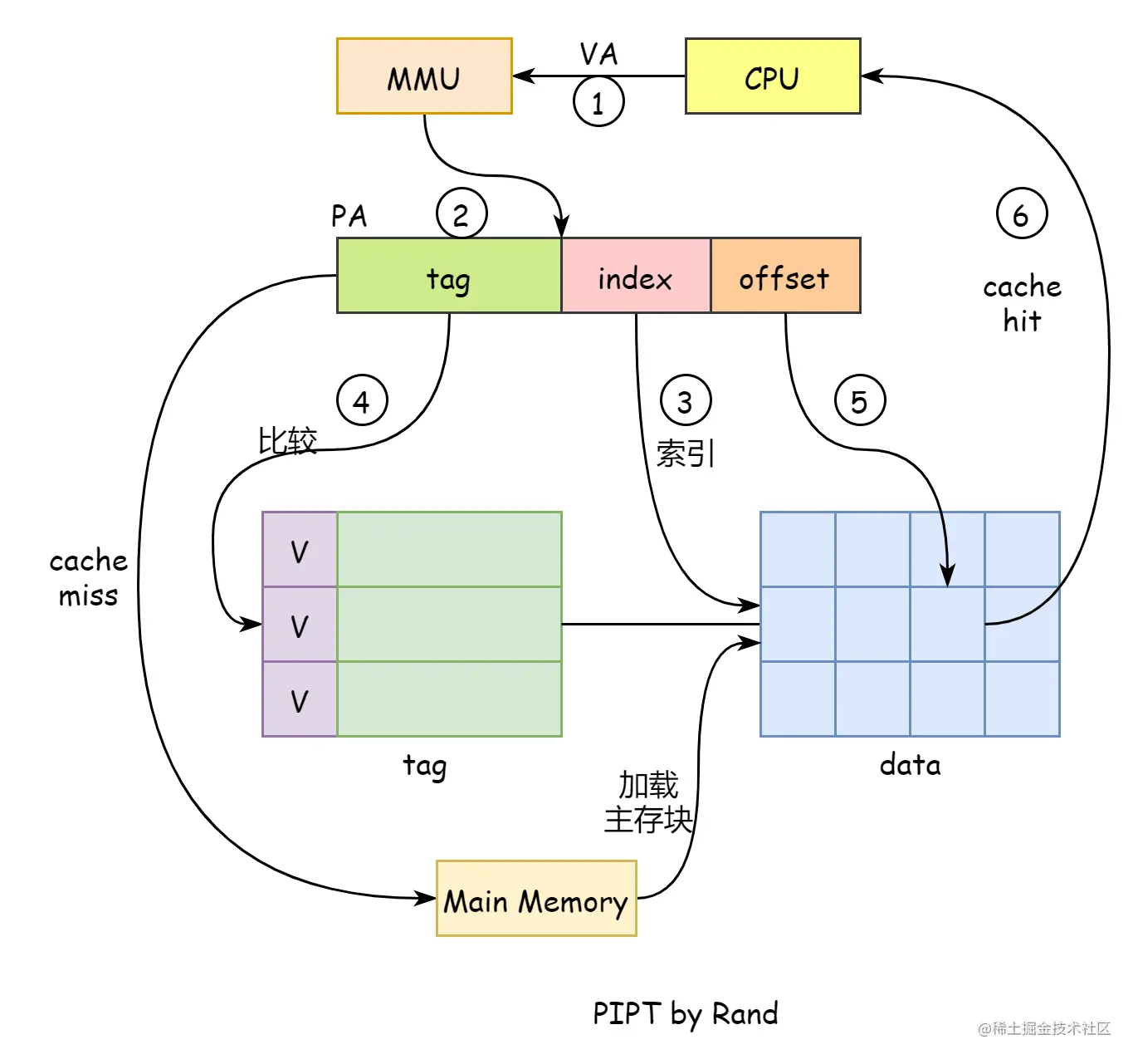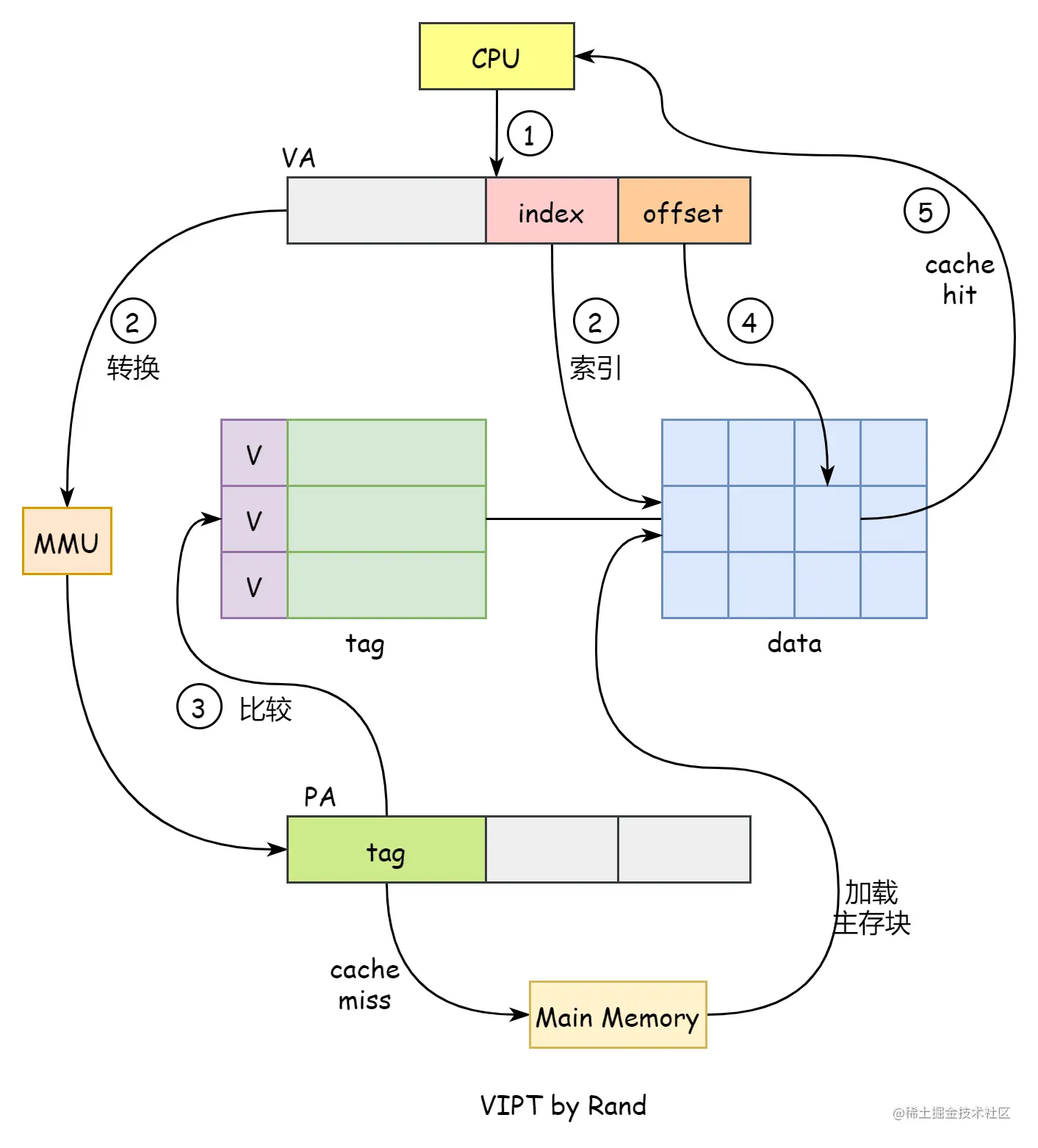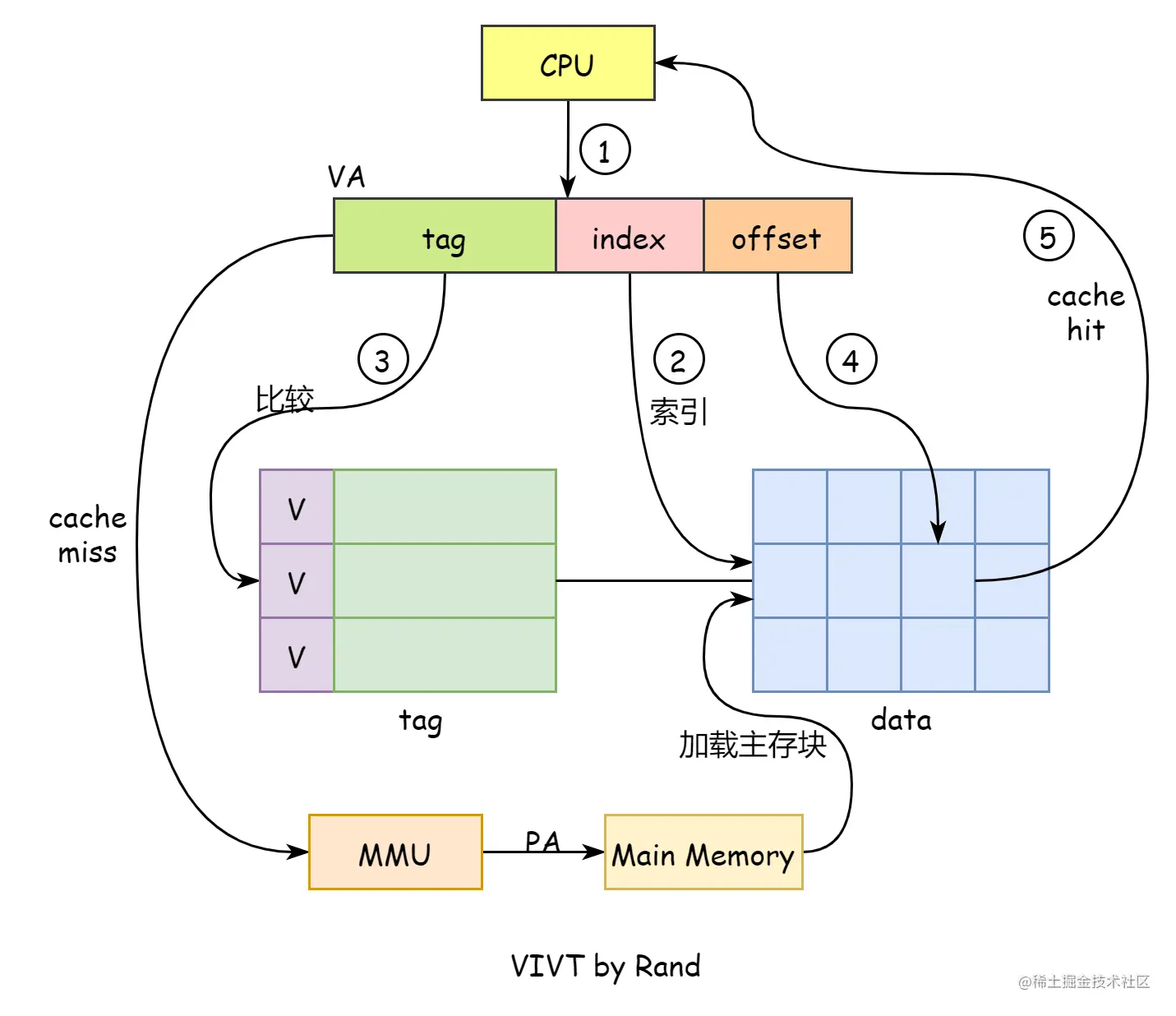VIVT 的寻址过程如上,先用 index 查 Cache,然后用 tag 做比较,命中的话再用 offset 选取相应的数据块,最后返回给 CPU。如果不命中 MMU 则将 VA 转换为 PA,访存然后将主存中的块加载到 Cache,重新获取数据返回给 CPU。