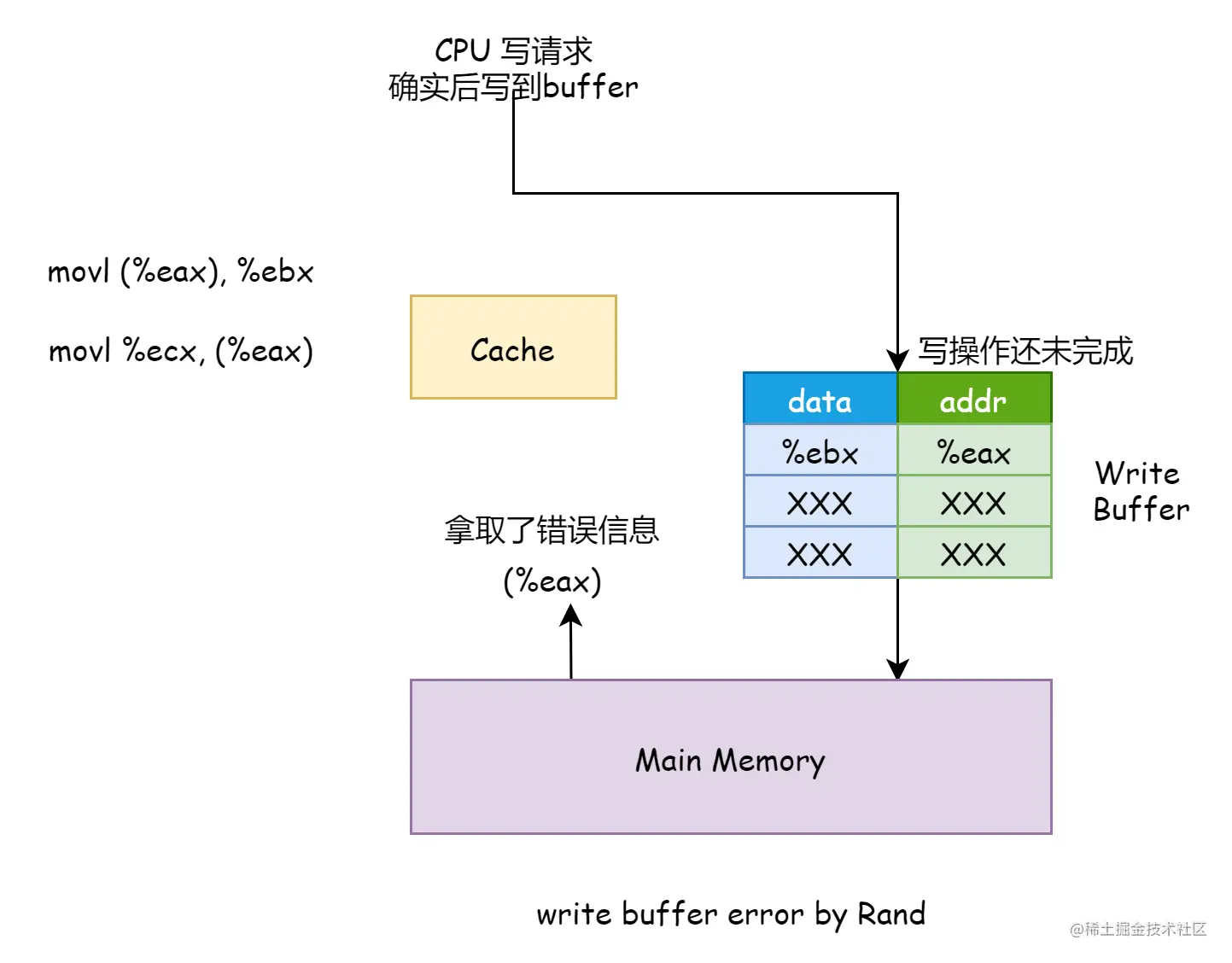 假如现在有这么一种情况,要将 ebx 寄存器里的值写到 eax 所表示的内存中去,然后紧接着又把 eax 所表示的内存值给读到 ecx 中去。再假设写的时候发生缺失,这时直接将数据写到 write buffer,然后 CPU 就直接返回去处理其他事情即读取相同地址的数据,又发生读缺失,读缺失需要阻塞从下一级存储获取数据,但是这时 write buffer 还没有完成写操作,则读取的数据错误。