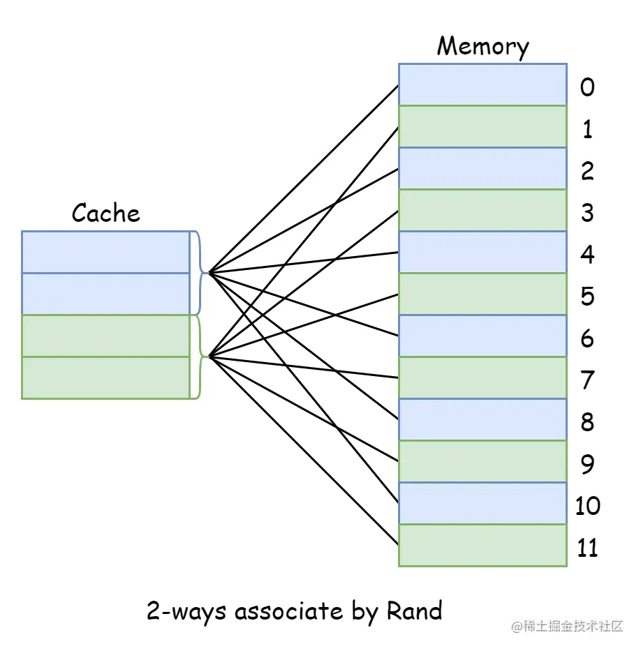 所谓组指的是若干 Cache Line 的集合,N 路指的是每个组中包含的 Cache Line 的行数,也称为相联度。一个主存块能放在一组的任意一行中。