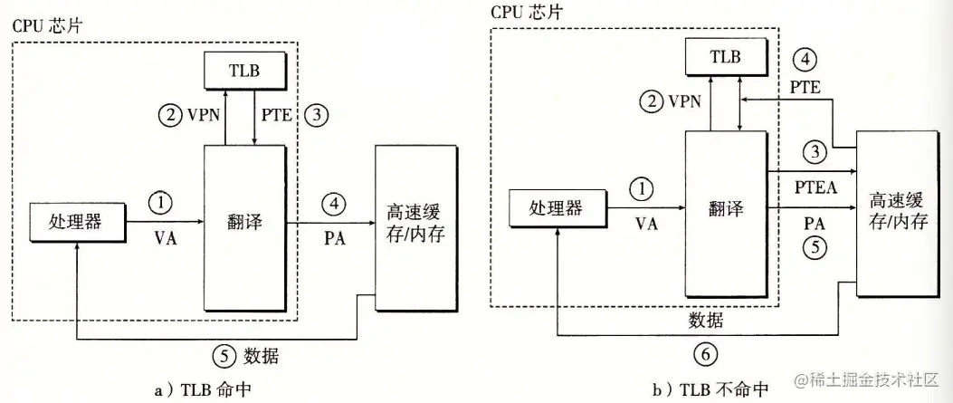 就多了一个先查询 TLB 的过程,不再赘述。有了 TLB 之后,MMU 对于页表项的获取就会先从 TLB 内进行,当 TLB 缺失的时候才会访问内存中的页表,由于局部性原理,命中率较高,根据 AMAT 的计算公式可知加入 TLB 之后获取页表项转换地址的速度将大大加快。