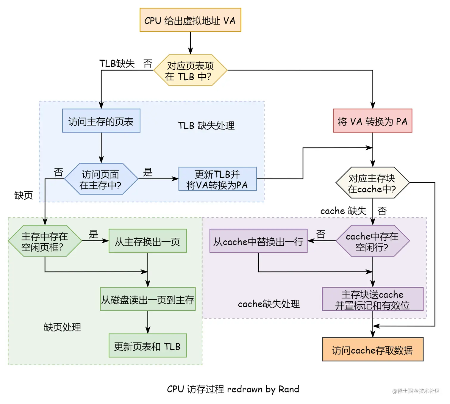 上面就是 Cache 的一些知识,这里再来讲述一种特殊的 Cache :TLB,它用来缓存页表项,加速地址转换。大家应该都知道一些虚拟存储,但其中的一些概念可能还是模模糊糊,比如说什么是虚拟内存,其概念众说纷纭,这个问题我比较认同这位大佬的答案 www.zhihu.com/question/29… 大家可以参考参考。另外各类地址的意思,怎么转换可以参考我前面讲计算机启动当中关于分段分页地址转换的讲述,本文就不做过多叙述。