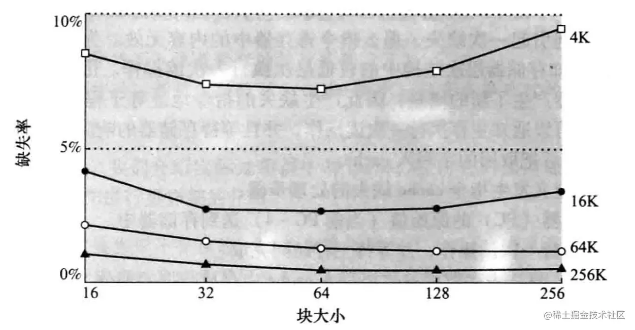 这张图来自计算机组成与设计,是根据实际情况测试出来的,不是胡乱瞎编的。每条缺陷代表不同的 Cache 容量,这里也就可以看出,Cache 容量的提高是可以降低缺失率的,这很明显整体容量变大容纳的数据更多缺失率自然会下降。