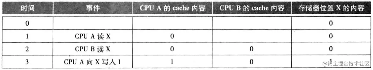 上述假设 Cache 的写策略是写通,CPU A 和 CPU B 先后读取 X 没问题,但是可以看出当 CPUA 向 X 写入 1 时,CPUA 的 CacheA 缓存的 X 和 主存中的 X 都变为 1,但是 CPUB 的 CacheB 缓存的 X 块并未变化,这就是一致性的问题,需要解决。