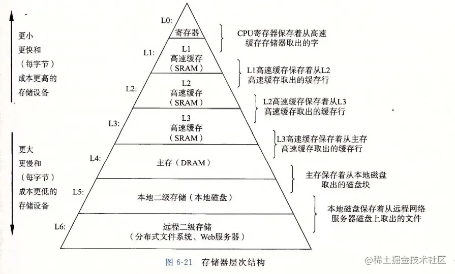 首先是存储器的层次结构,大家应该都很熟悉了,就是那个金字塔图,再来看看:
