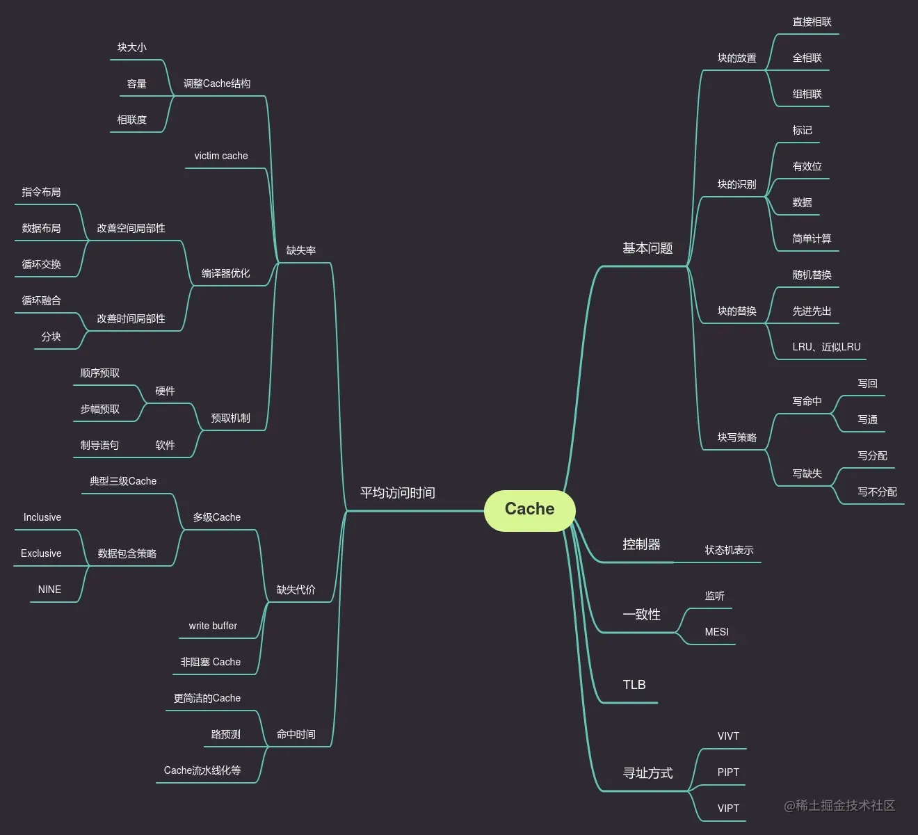 前面一直没有讲述 Cache 方面的内容,最近较为深入学习了这部分内容,捋了一下写出本文。内容较多涉及较广,画了张思维导图,可以先看看好有个总体把握