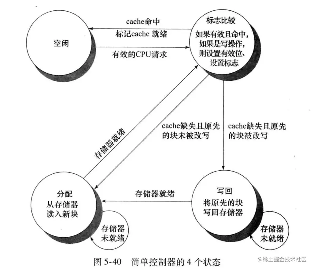 一个 Cache 控制器的实现还是有些复杂的,就算简单的 Cache 控制器,涉及的东西也很多,数字逻辑的知识,verilog 语言等等,这些都不讲述,我们来看一个简单的 Cache 控制器的 状态机 即可。有兴趣的可以详细参考 计算机组成与设计 这本书的 Cache 控制器实现,作者还提供了一个 Cache 控制器的源码,有兴趣的可以看看。