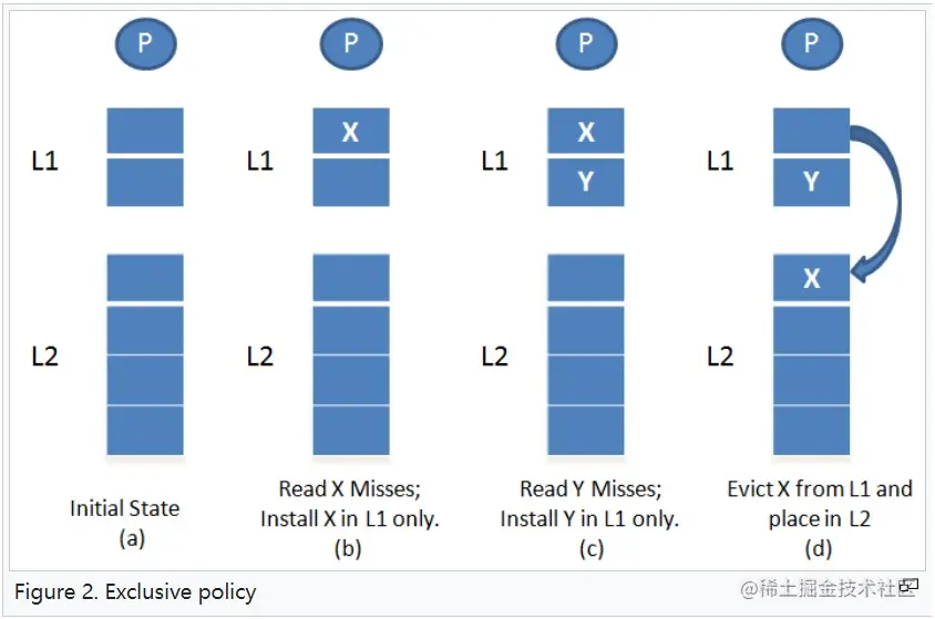 如果驱逐 L1 中的块,将该块移动到 L2,这是填充 L2 唯一的方式,此时 L2 就像一个 Victim Cache