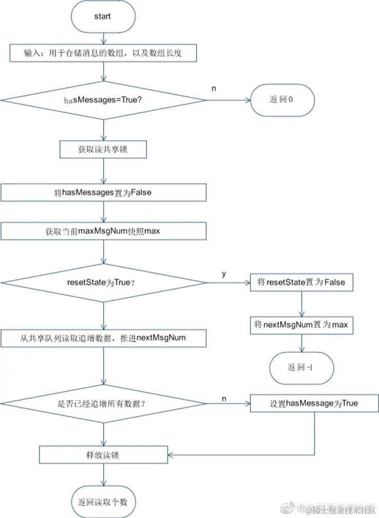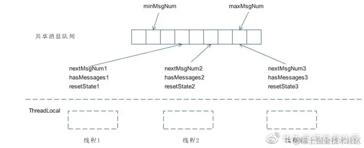 NOTE:在读取共享消息队列过程中,每个线程推进自己的nextMsgNum位置,以方便记录数据追增情况。