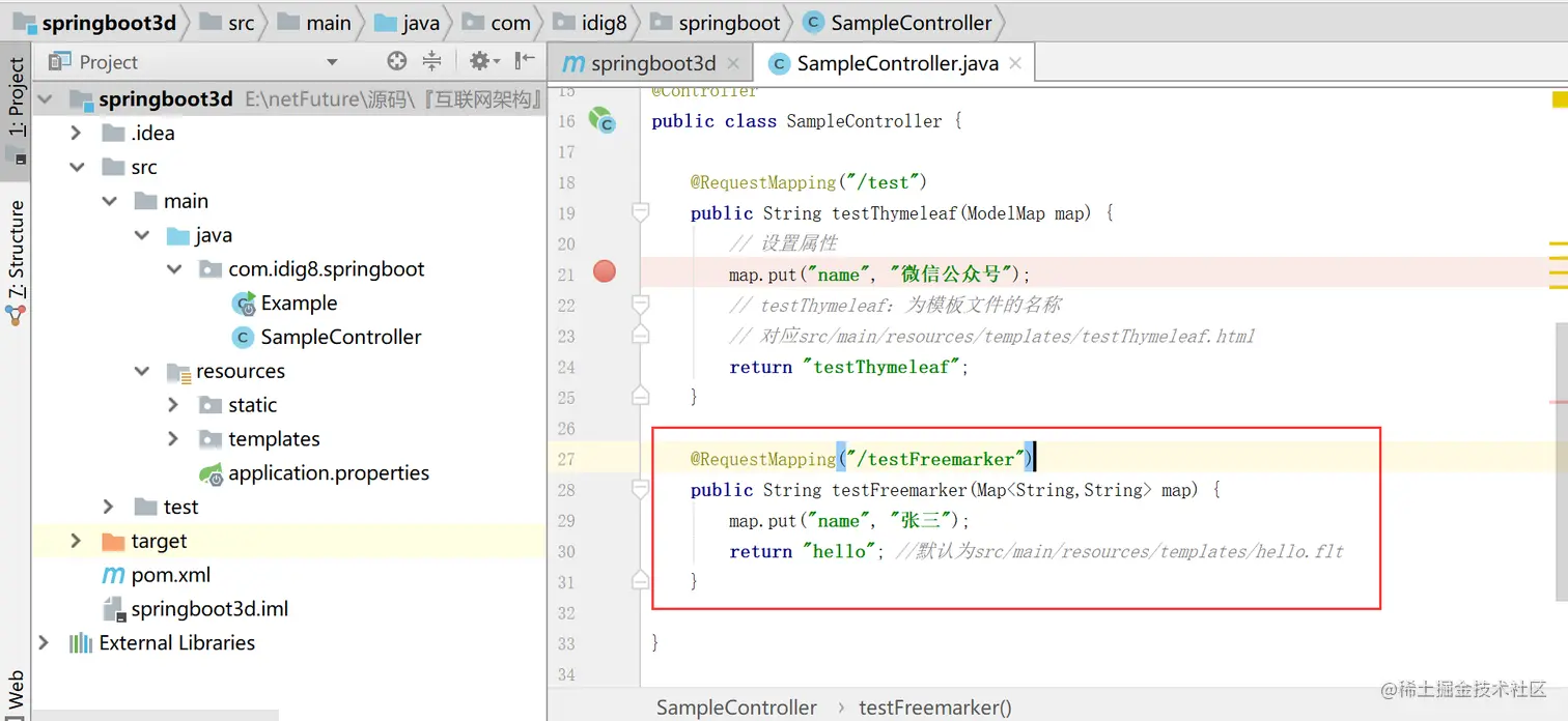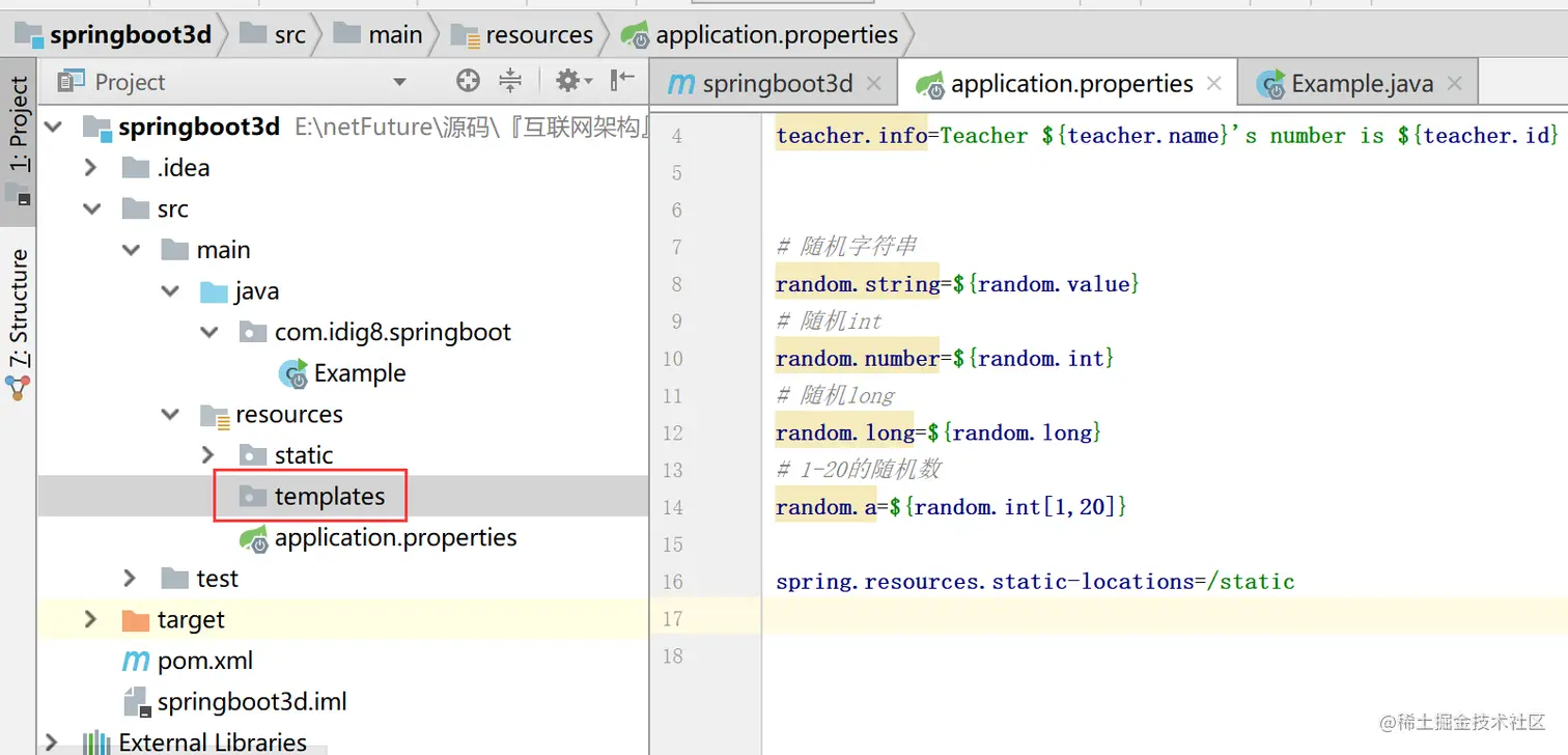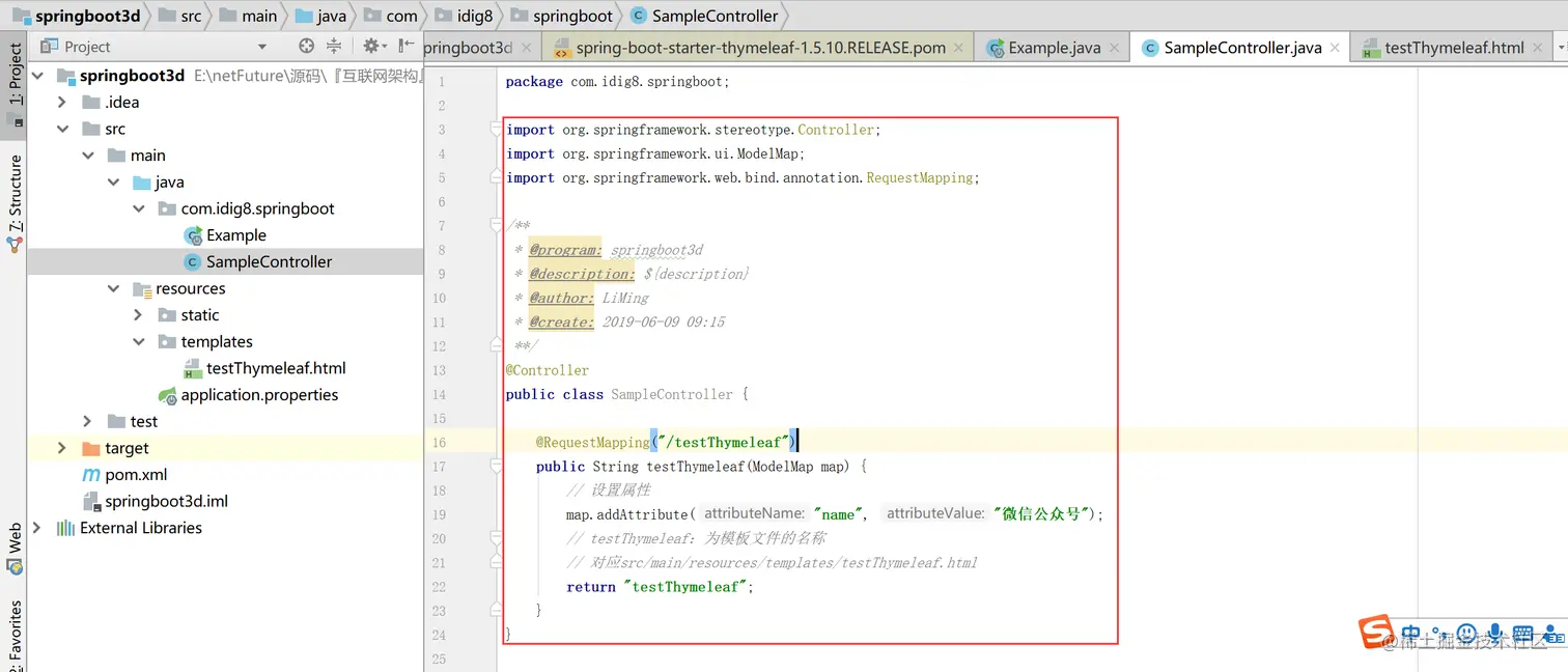 Spring boot默认的模板配置路径为:src/main/resources/templates。当然也可以修改这个路径,通过配置文件的属性,这个在上次的配置的文件的里面有详细的解释配置里面有。