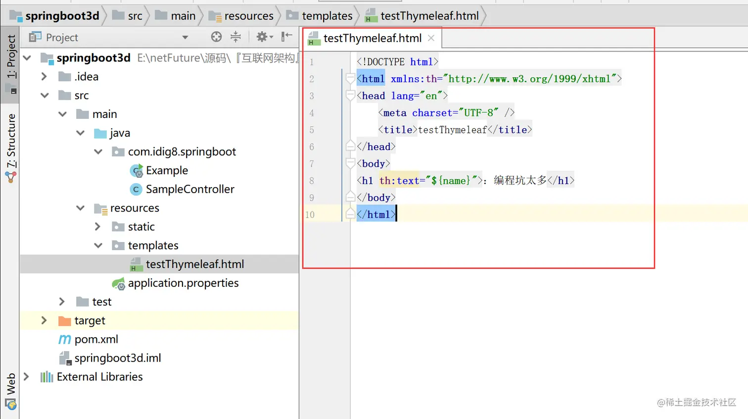 3.在src/main/resources/下面建立templates/testThymeleaf.html