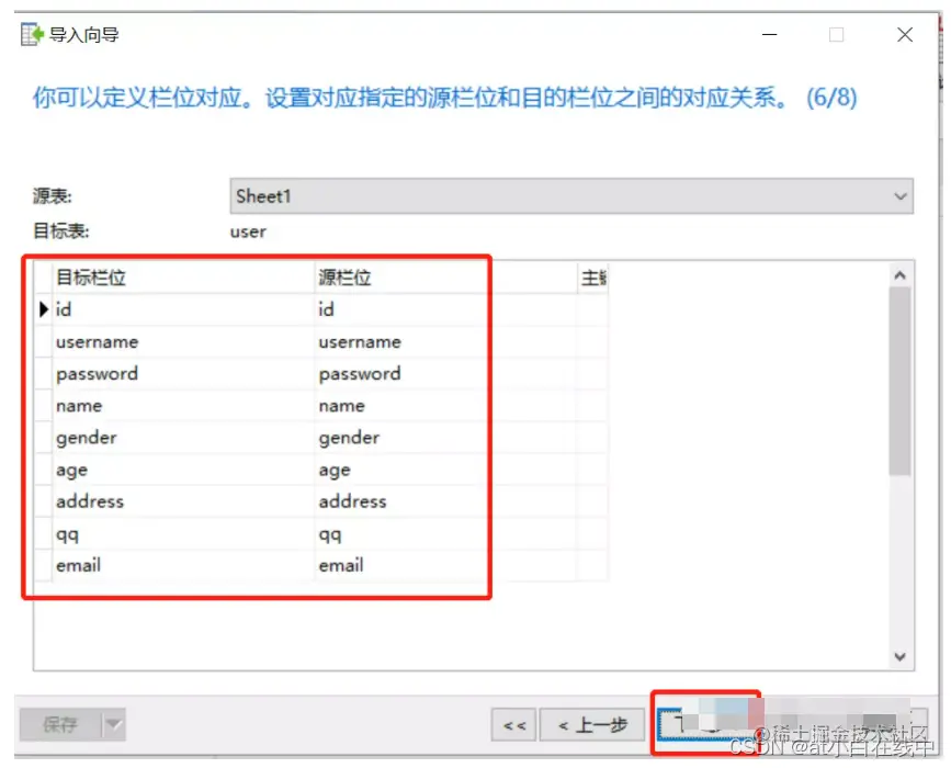 9.直到进入如下界面后查看目标栏位与原栏位的对应,点击下一步如下图: