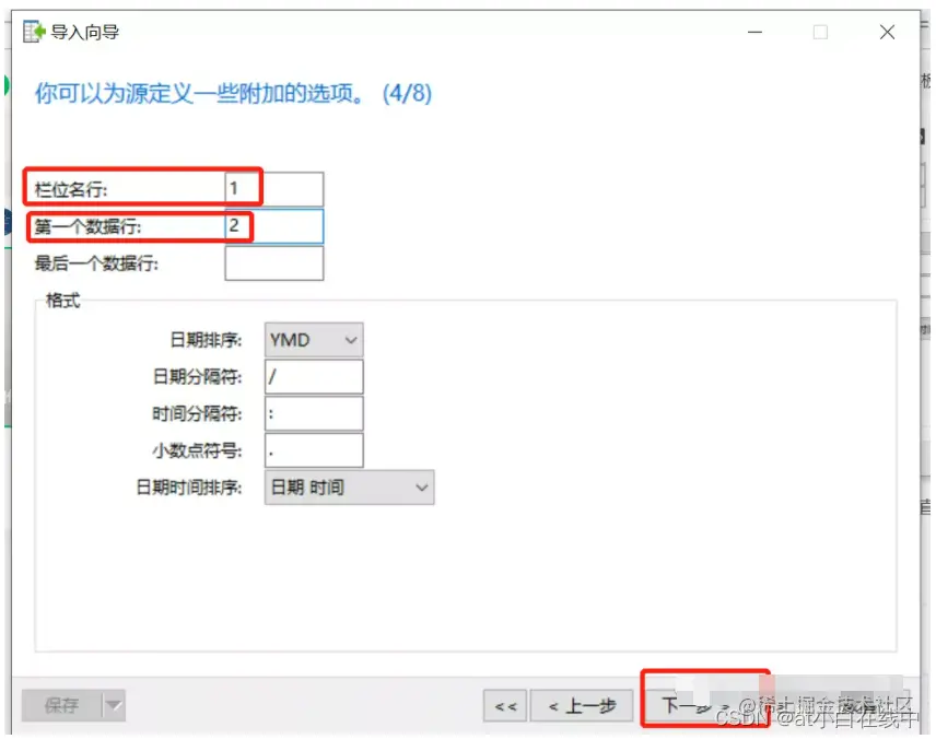 7.点击下一步后就需要选择“栏位名行”和“第一个数据行”,这两个部分按照实际情况进行操作,如下图: