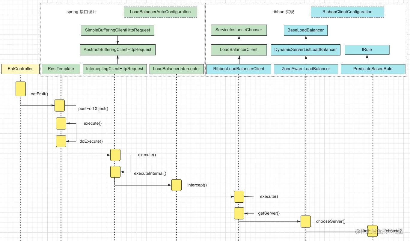汇总结论前,我们先看一下 spring-boot 与 ribbon 整合时的时序图(RestTemplate形式下);
