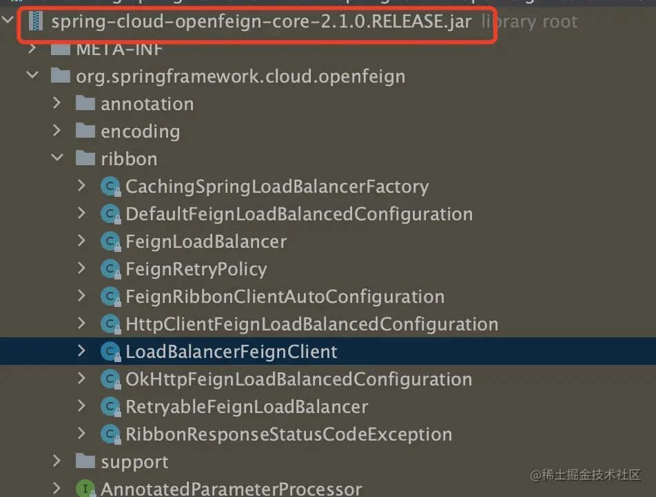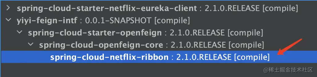 当我点开feign-core 源码的时候,不经意间看到一个ribbon 的目录,😄 猜测这玩意一定是自己就继承好了ribbon,使用maven查看依赖,果然如此,自个就给整好了;