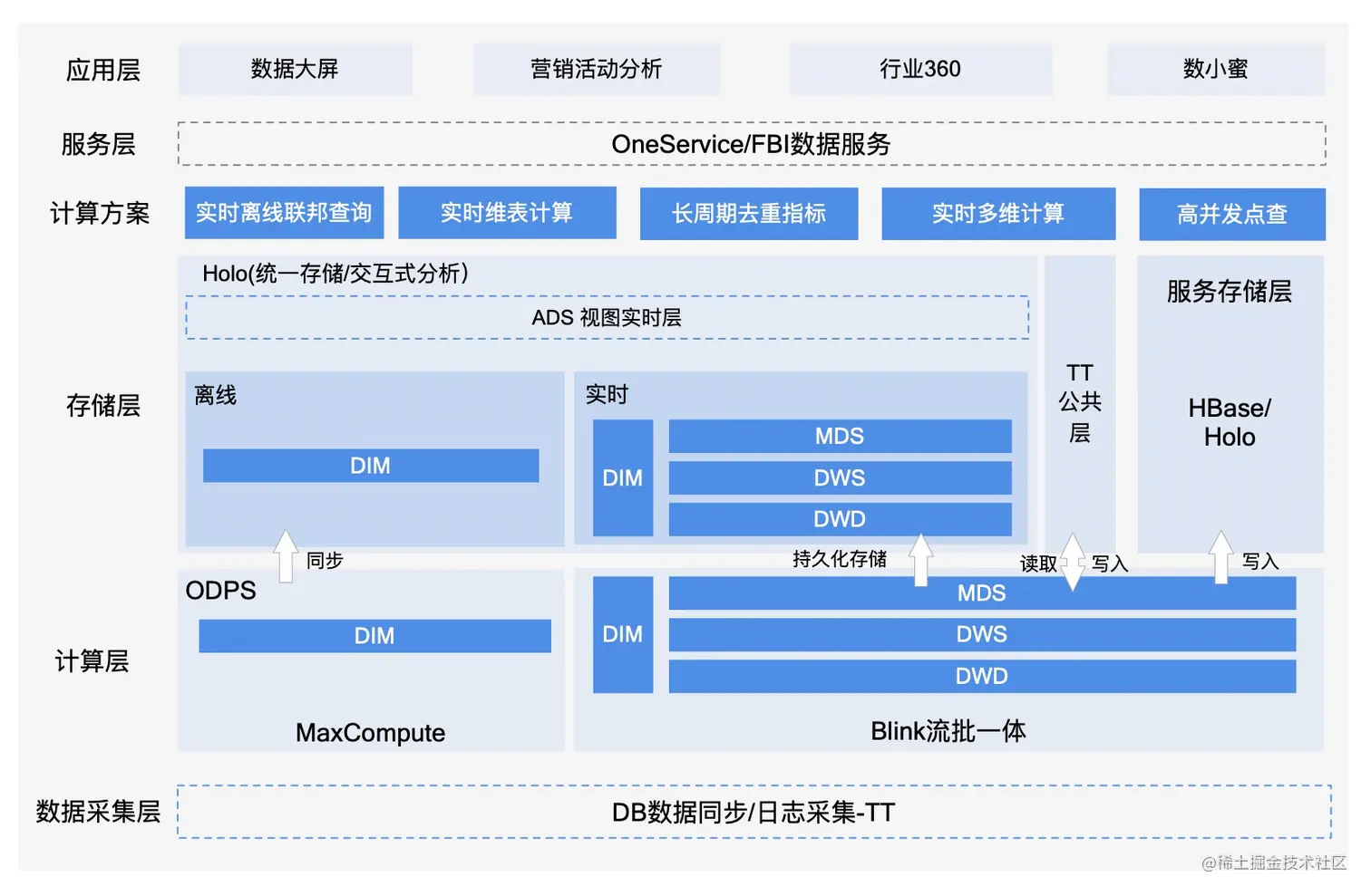 **挑战与优化:**实时离线的数据存在一定GAP,在多日的周期下,差异累积放大,导致影响业务的决策判断,另一方面大促期间人力开发资源紧张,如果用离线数据进行覆盖,成本额外增加一倍。在此背景下,引入了流批一体的技术方案,使用Hologres进行统一存储与计算,并且通过Blink Batch实现了实时离线共用同一套代码,计算逻辑统一,大幅度降低了重复开发与后续运维成本。