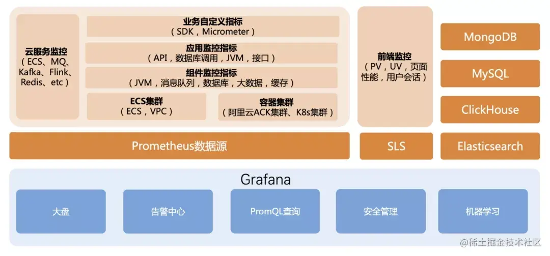 - 针对于基础架构层,Prometheus 监控服务对包括 ECS、VPC、容器在内的各类云服务以及三方中间件进行监控。