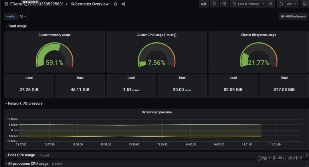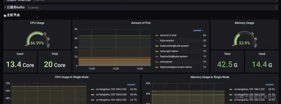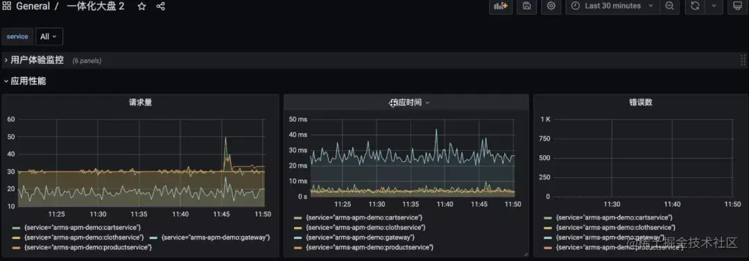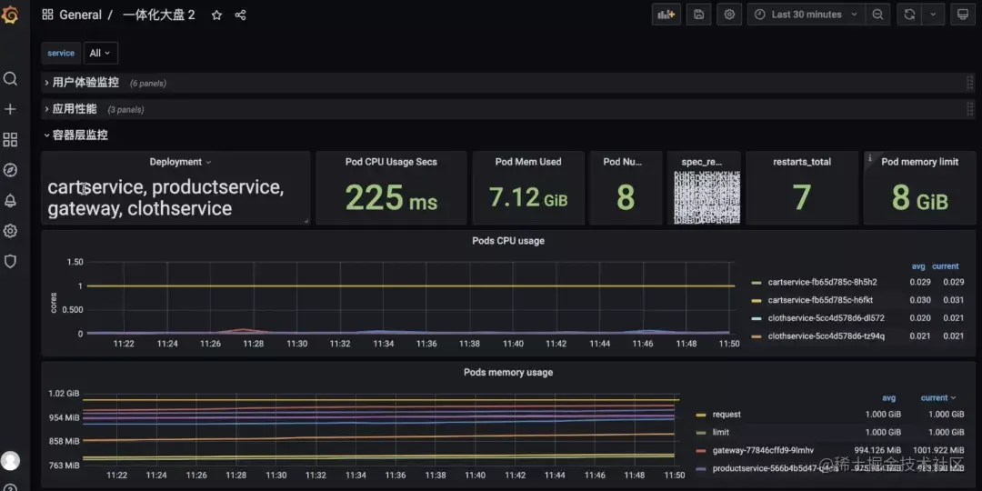 可以看到,Grafana 虽然帮助大家把各种数据看板搭建起来,但看到的依旧是零散大盘。在日常运维过程中,还需要基于业务域或基于应用创建统一大盘,能够将基础架构层、容器层、应用层、用户终端层的数据都放到同一个大盘中进行展现,从而实现整体监控。