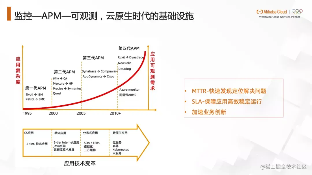 进入到 2000 年,互联网飞速发展,浏览器成为新的用户界面。应用演进成为基于浏览器的 Browser-App-DB 的三层架构,同时 Java 作为企业级软件的第一编程语言开始盛行,编写一次、到处运行(write once,run anywhere)的理念,极大的提升了代码的生产力,然而 Java 虚拟机也屏蔽了代码运行的细节,使得调优排错变得愈加困难, 所以对于代码级的跟踪诊断和数据库的调优成为新的关注点,从而诞生了新一代的监控工具 APM(应用性能监控)。