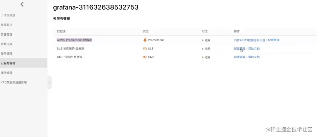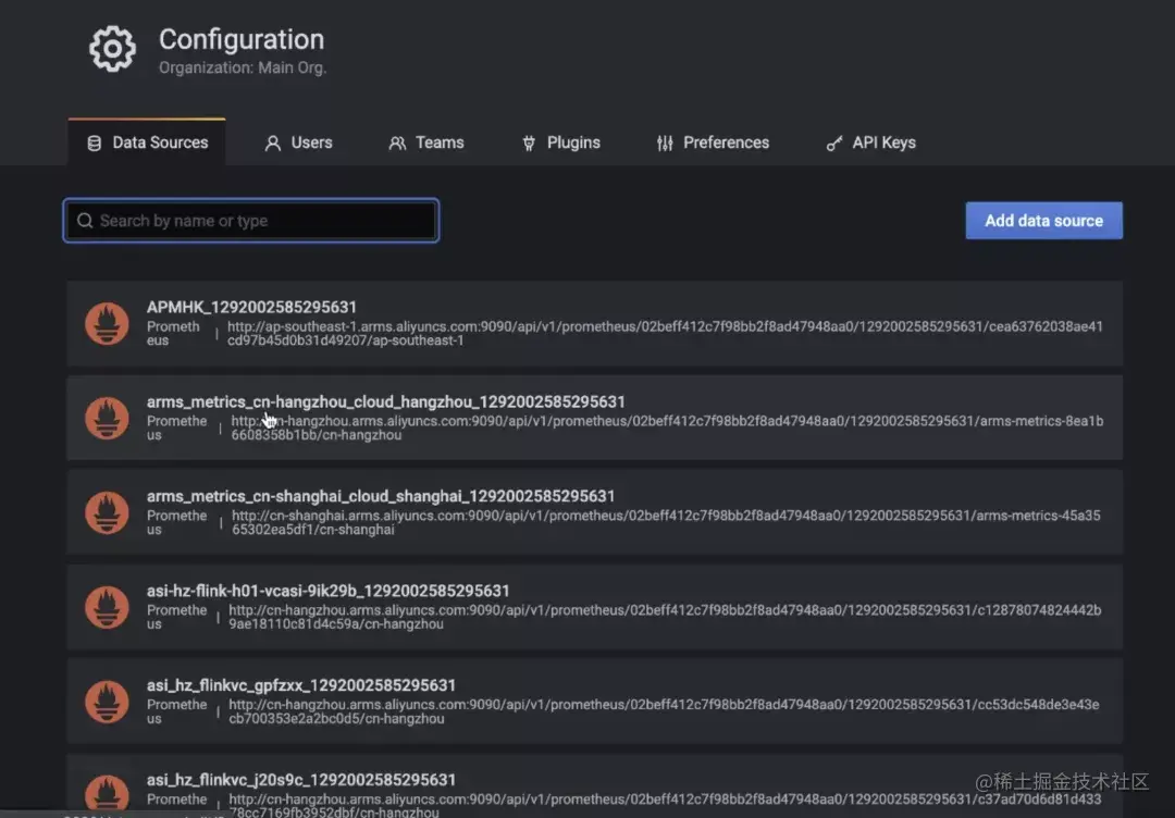 在 ARMS 中,我们可以快速建立一个 Grafana 独享实例,ARMS Prometheus、SLS日志服务、CMS 云监控数据源都可以非常便捷的进行数据同步。打开 Configuration,可以快速查看相应数据源。在时间快速接入各种数据源的同时,尽可能降低日常数据源管理的工作量。