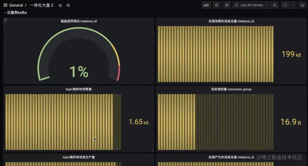 此外,就是相关的云服务监控,这里以消息队列 Kafka 举例,像消息服务常见的相关数据指标如消费量堆积、消费量等数据。