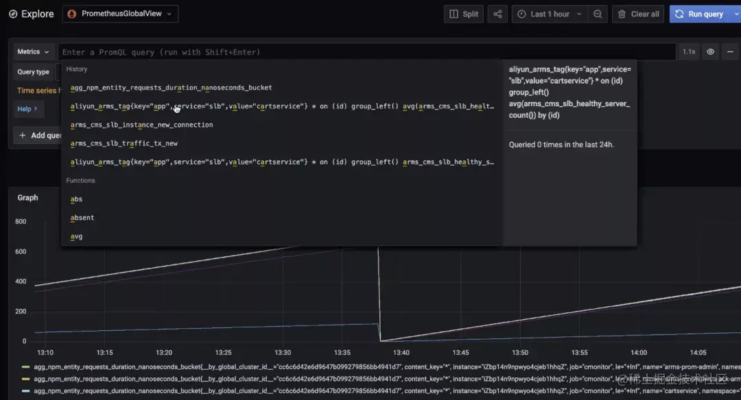 这样子,这张大盘就覆盖了从用户体验层到应用层到基础架构容器层的整体性能监测情况。更加重要的是整个大盘包含着所有微服务的相关数据。当切某个服务,服务相关联的性能数据都将独立展现出来。在容器、应用、云服务等不同层面都进行过滤。这里稍微提一下是怎么做到的,当 Prometheus 监控去采集这些云服务时,会顺带把云服务上的 tag 都采集下来。通过对 tag 进行打标,就可以把这些云服务基于不同业务维度或不同应用进行区分。在做我们统一大盘的时候,一定会遇到非常多的数据源管理问题。这里我们提供了 globalview 能力,把这个用户名下所有的 Prometheus 实例都汇聚到一起,统一进行查询。不管是应用层的信息,还是云服务的信息。
