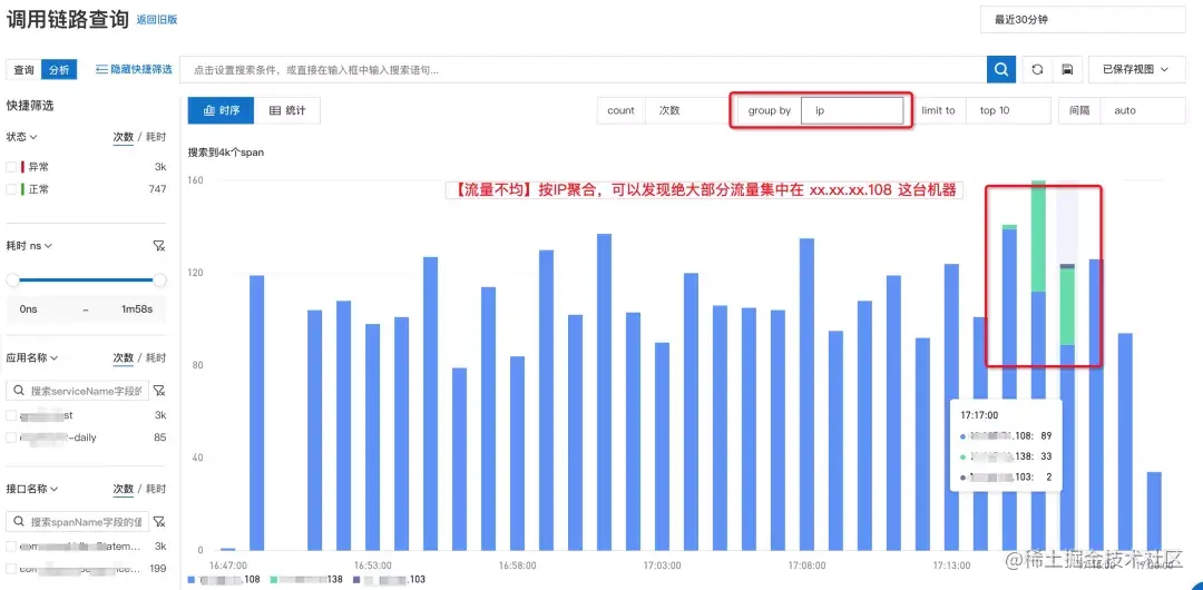 通过链路分析按 IP 分组统计链路数据,快速了解调用请求分布在哪些机器上,特别是问题发生前后的流量分布变化,如果大量请求突然集中在一台或少量机器,很可能是流量不均导致的热点问题。再结合问题发生点的变更事件,快速定位造成故障的错误变更,及时回滚。