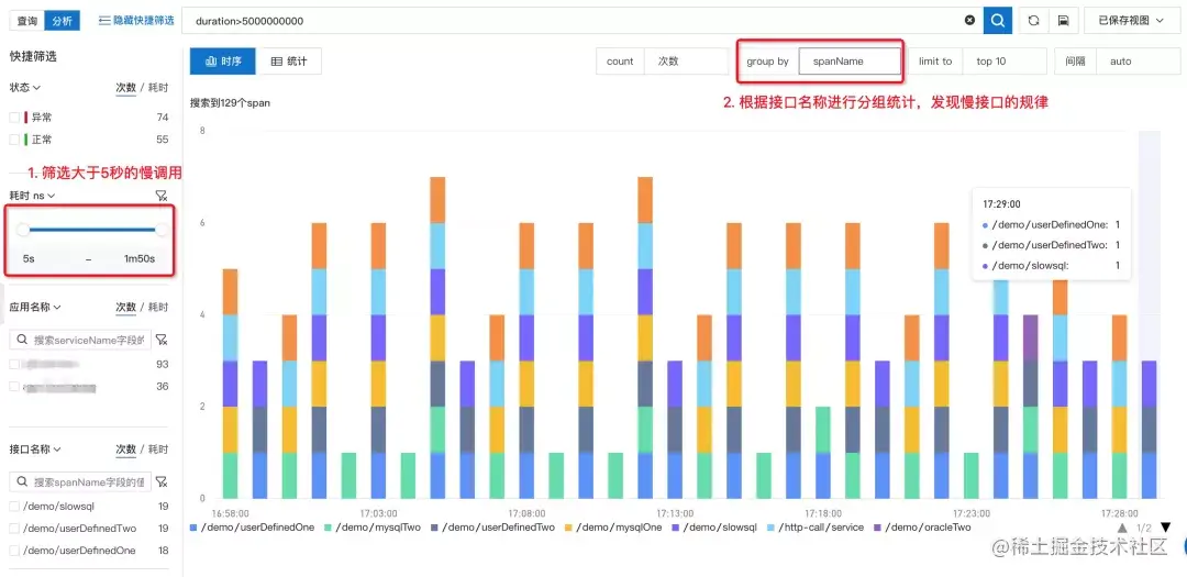 此时,可以通过链路分析筛选出耗时大于一定阈值的调用,再根据接口名称进行分组统计,这样就可以快速定位慢接口的列表与规律,然后对出现频率最高的慢接口逐一进行治理。