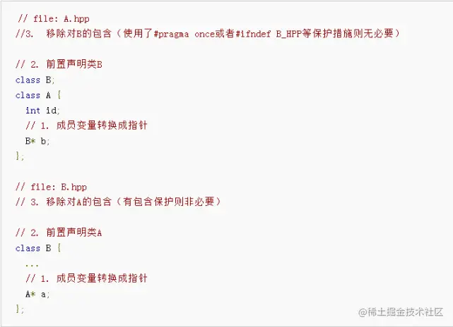 前两种用途好理解,第三种稍微复杂点,但却是前置声明最重要的用途。其解决类A包含类B,同时类B包含类A的依赖问题。循环依赖一般是设计层面的问题,可通过接口、引入辅助类等手段化解。前置声明也能解决,只是架构上稍微别扭。