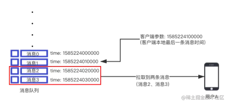 ③ 客户端根据本地存储的消息最大时间戳,去服务端拉取消息。