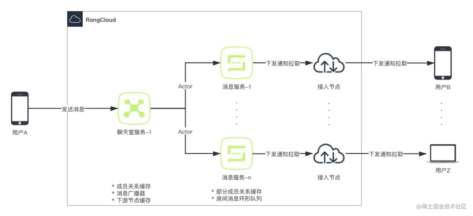 在图 3 中,用户 A 在聊天室中发送一条消息,首先由聊天室服务处理,聊天室服务将消息同步到各消息服务节点,消息服务向本节点缓存的所有成员下发通知拉取,图中服务器向用户 B 和用户 Z 下发了通知。