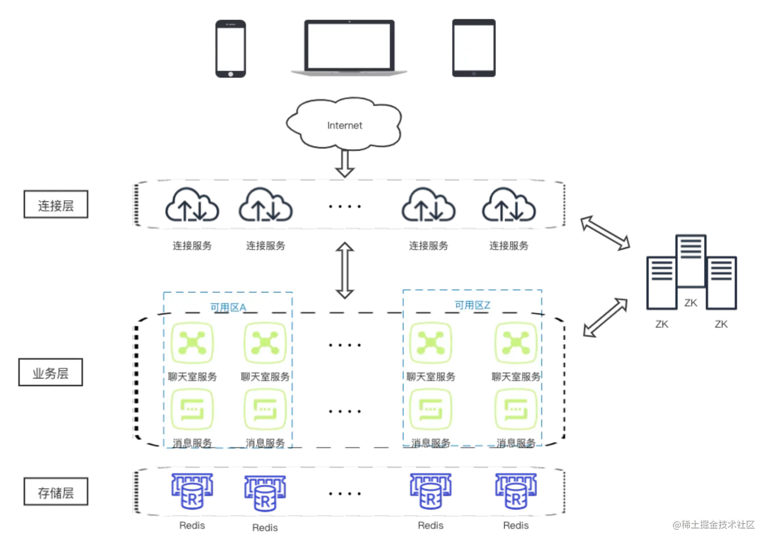 **业务层:**这是整个聊天室的核心,为了实现跨机房容灾,融云将服务部署在多个可用区,并根据能力和职责,将其分为聊天室服务和消息服务。