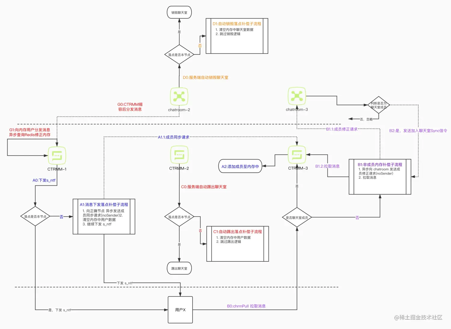 聊天室服务在进行扩缩容时,可以通过 Redis 来加载成员列表、封禁 / 黑白名单等信息。需要注意的是:在聊天室进行自动销毁时,需先判断当前聊天室是否应该是本节点的。如果不是,跳过销毁逻辑,避免 Redis 中的数据因为销毁逻辑而丢失。细节如下图 2:
