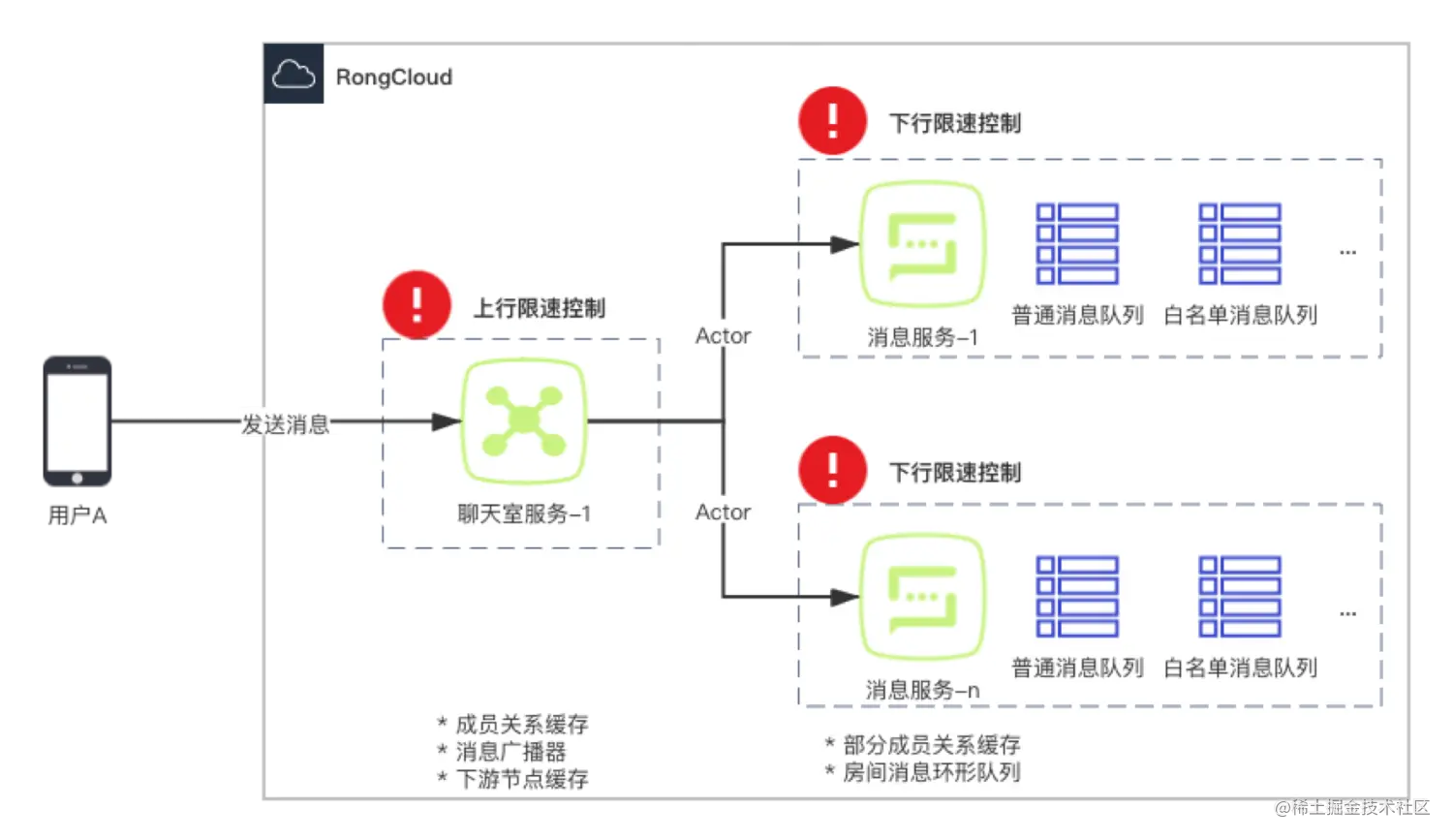 **服务器上行限速控制(丢弃)策略:**针对单个聊天室的消息上行的限速控制,默认为 200 条 / 秒,可根据业务需要调整。达到限速后发送的消息将在聊天室服务丢弃,不再向各消息服务节点同步。
