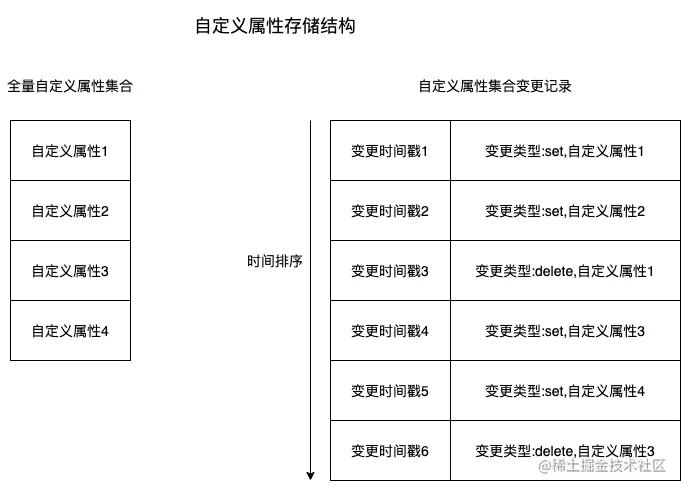 属性变更记录采用的是一个有序的 map 集合。key 为变更时间戳,value 里存着变更的类型以及自定义属性内容,这个有序的 map 提供了这段时间内所有的自定义属性的动作。