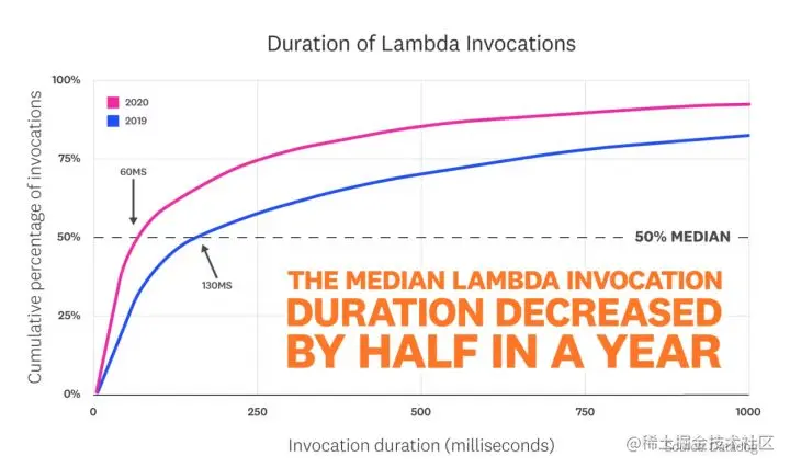 在一项调研报告里,Lambda 的调用率是两年前的 3.5 倍,冷启动延时也比一年前要短得多。[6]