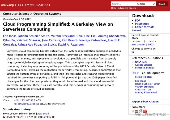 十年后,又在论文《Cloud Programming Simplified: A Berkeley View on Serverless Computing》中对 Serverless 的概念进行了描述,再次预测了 Serverless 的挑战及需要解决的问题。[2]