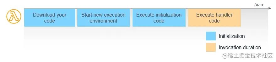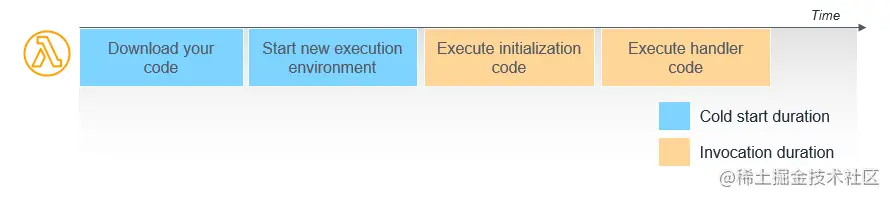 首当其冲的便是「冷启动」,即下图的蓝色部分。尽管设置环境和代码这两个步骤耗费的时间并不需要付费,但它会增加整个调用持续时间的延迟。这会对一些时延敏感型业务造成影响。