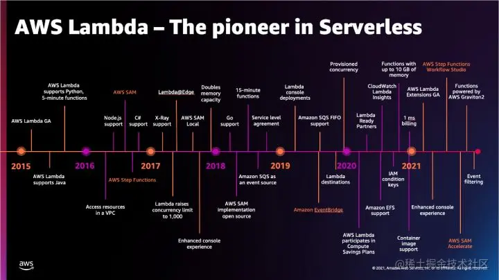在 2014 年的「亚马逊云科技 re: Invent 全球大会」上,Amazon 首次引入了 Lambda。再加上次年发布的 API Gateway,Serverless 配合已有的云服务开始崭露头角,它不再是学术圈的理念,走出了一条能够实际应用的产品化道路。