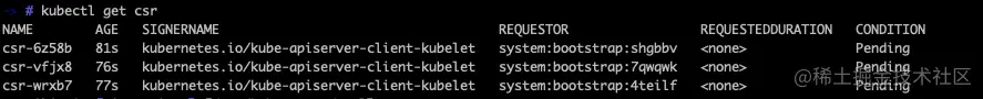 kubelet 服务启动之后,会向master节点,发送证书请求,需要在master节点批准这些证书请求。