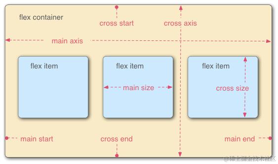 - flex每个项目占据的主轴空间为 (main size), 占据的交叉轴的空间为 (cross size)这里需要强调,不能先入为主认为宽度就是 main size,高度就是 cross size,这个还要取决于你主轴的方向,如果你垂直方向是主轴,那么项目的高度就是 main size。