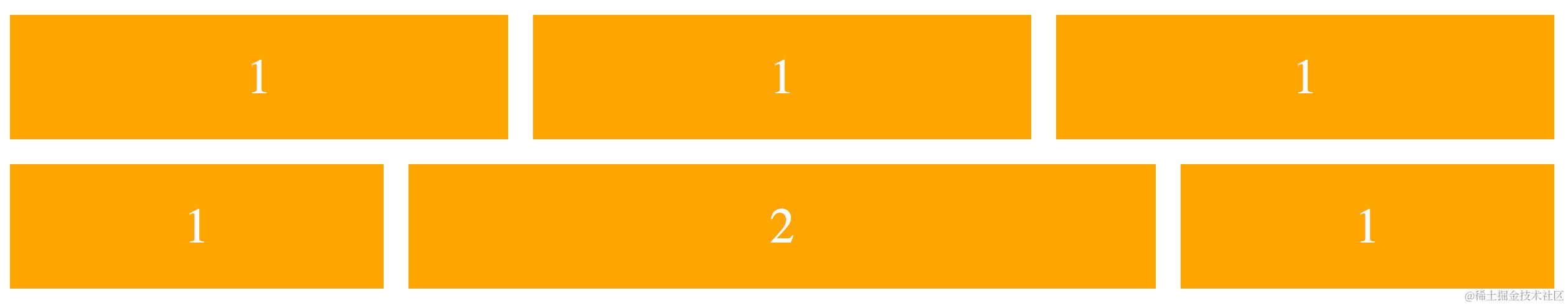 - 如果所有项目的 flex-grow 属性都为 1,则它们将等分剩余空间。(如果有的话)
