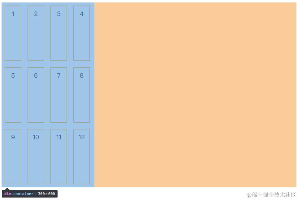 值得注意的是,虽然在每条轴线上项目的默认值也为 stretch,但是由于我每个项目我都设置了高度,所以它并没有撑开整个容器。如果项目不设置高度的话就会变成下面这样: