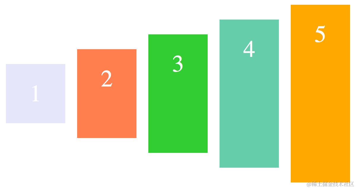 假设容器高度设置为 100px,而项目分别为 20px, 40px, 60px, 80px, 100px, 则如上图显示。
