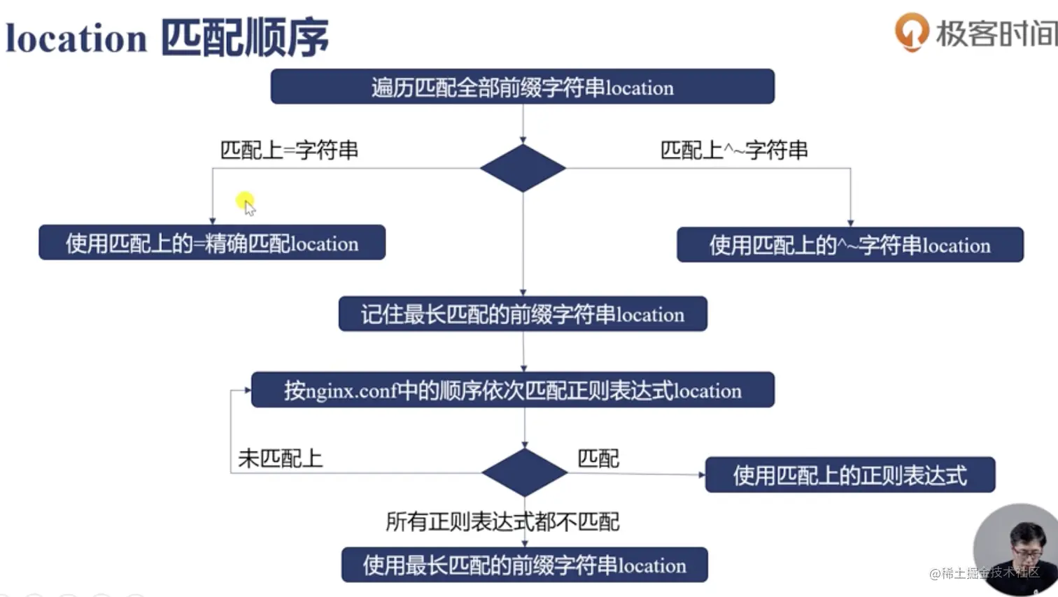 当匹配到一个没有^~的location时,记住最长匹配的前缀字符串,然后按照nginx.conf中配置的顺序去匹配正则表达式,如果匹配到正则表达式,则立即使用对应的location,如果没有匹配到正则表达式,则使用最长匹配的前缀字符串。